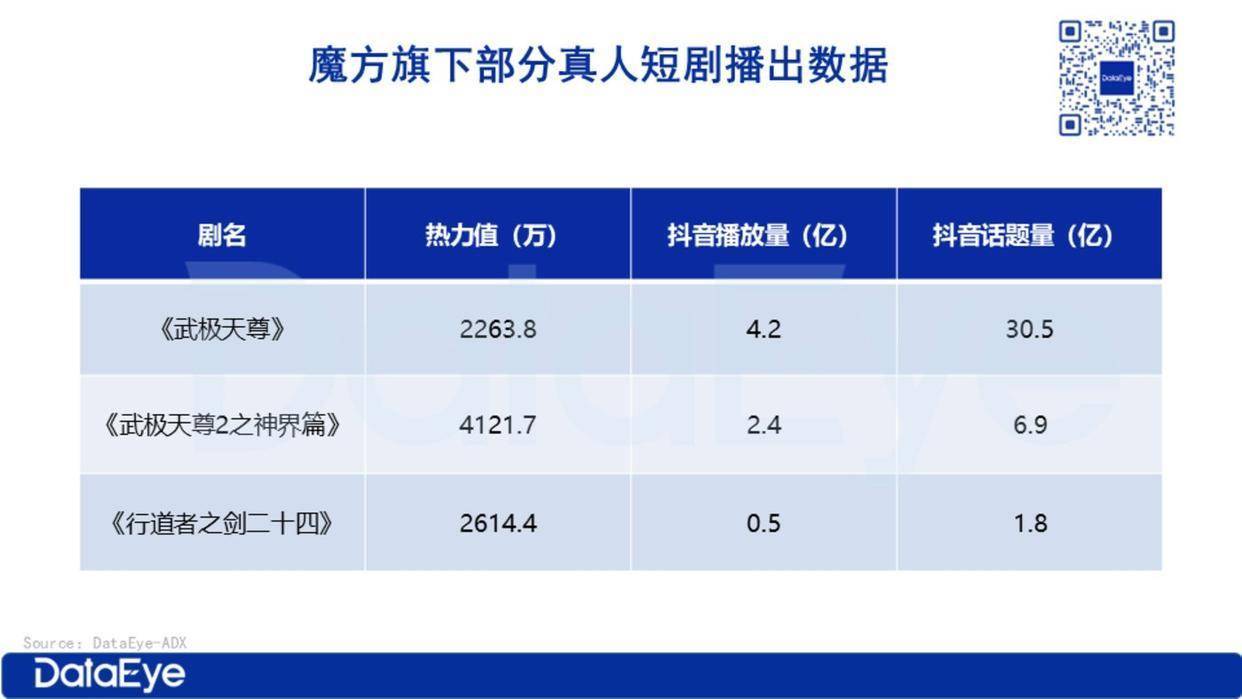 撑持这一计算的中枢基础,是实足的IP储备。据DataEye-ADX数据,公司有关短剧超500部,集合了多数可改编的真东谈主IP;其中《武极天尊》系列真东谈主短剧发扬隆起,抖音播放量碎裂6亿次,话题量近40亿次。