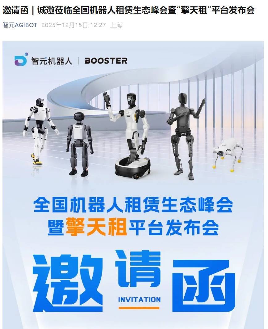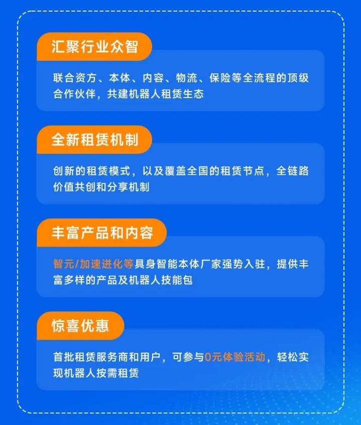 IT之家从邀请函先容获悉,智元将打造“全新租借机制”,租借节点脱色寰球,智元、加快进化等机器东说念主厂商入驻平台,首批租借奇迹商和用户可参与 0 元体验行径。