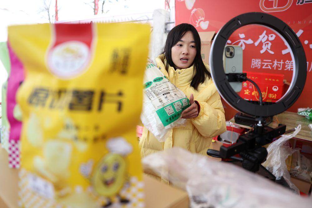 自媒体博主蔡雪芳在年货大集上通过直播带货的花式推介定西宽粉(1月19日摄)。新华社记者 陈斌 摄