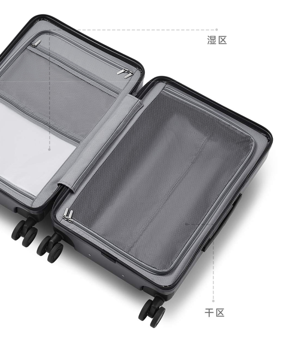 该行李箱提供深灰银、远山绿两种配色,接受复合 PC 箱壳,前仓可怒放,收纳 16 英寸札记本电脑。行李箱里面则使用双 U 型拉链内装结构,同期提供了湿物品收纳层,便于整理。